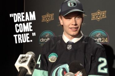 Julius Miettinen, choix de deuxième ronde du Seattle Kraken, rencontre les médias de la LNH lors du repêchage 2024 au…