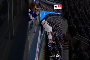 C’était un moment effrayant 😬🏒 Lors d’un match Leafs vs Blackhawks, un fan se penche trop par-dessus la balustrade et…