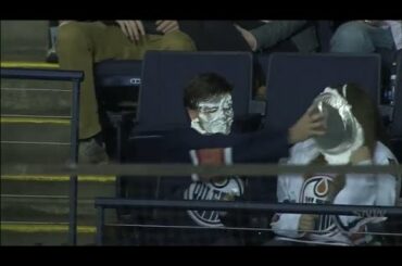 Un partisan des Oilers d’Edmonton reçoit une tarte au visage de la mascotte des Predators de Nashville; le fan prend…