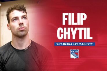 L’attaquant des Rangers de New York, Filip Chytil, répond aux questions des médias après la première journée du camp d’entraînement,…