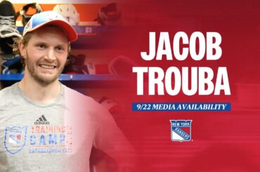 Le capitaine des Rangers de New York, Jacob Trouba, répond aux questions des médias après la deuxième journée du camp…