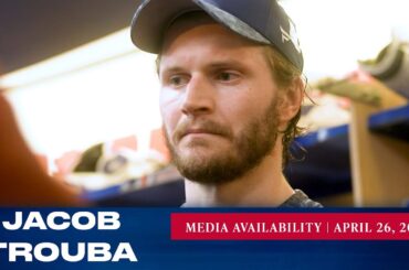 Le capitaine des Rangers de New York, Jacob Trouba, répond aux questions des médias après l’entraînement du 26 avril. »…