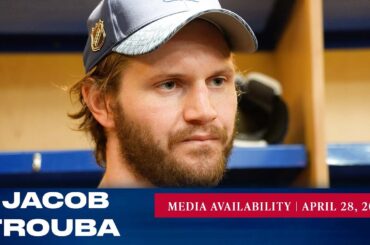 Le capitaine des Rangers de New York, Jacob Trouba, répond aux questions des médias après l’entraînement du 28 avril. »…