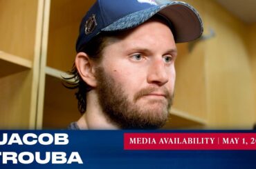 Le capitaine des Rangers de New York, Jacob Trouba, répond aux questions des médias après le match du 1er mai…