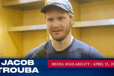 Le capitaine des Rangers de New York, Jacob Trouba, répond aux questions des médias après le match du 13 avril…