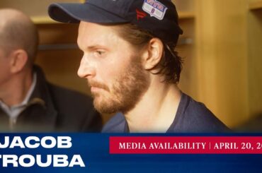 Le capitaine des Rangers de New York, Jacob Trouba, répond aux questions des médias après le match du 20 avril…
