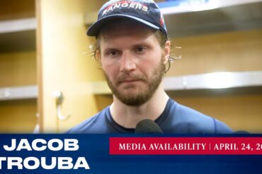 Le capitaine des Rangers de New York, Jacob Trouba, répond aux questions des médias après le match du 24 avril…