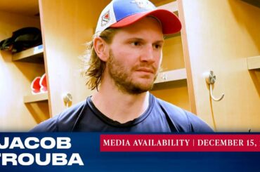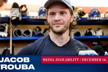 Le capitaine des Rangers de New York, Jacob Trouba, répond aux questions des médias après l’entraînement du 14 décembre. »…
