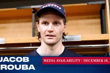 Le capitaine des Rangers de New York, Jacob Trouba, répond aux questions des médias après le match du 18 décembre…