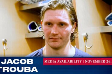Le capitaine des Rangers de New York, Jacob Trouba, répond aux questions des médias après le match du 26 novembre…