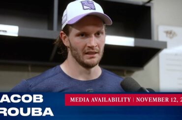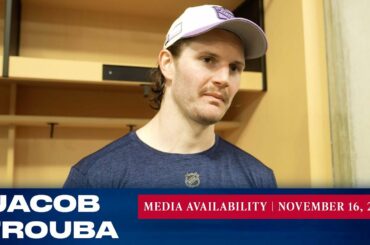Le capitaine des Rangers de New York, Jacob Trouba, répond aux questions des médias après l’entraînement du 16 novembre. »…