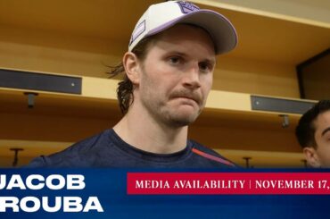 Le capitaine des Rangers de New York, Jacob Trouba, répond aux questions des médias après le match du 17 novembre…