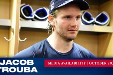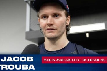 Le capitaine des Rangers de New York, Jacob Trouba, répond aux questions des médias après le match du 26 octobre…