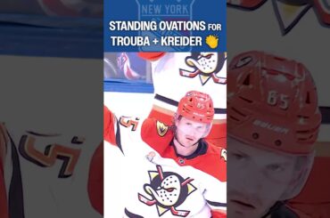 Les anciens Rangers de New York Chris Kreider et Jacob Trouba reçoivent les ovations de la foule au Madison Square…