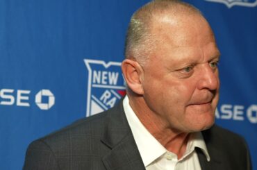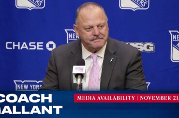 L’entraîneur des Rangers de New York, Gerard Gallant, répond aux questions des médias après le match du 21 novembre contre…