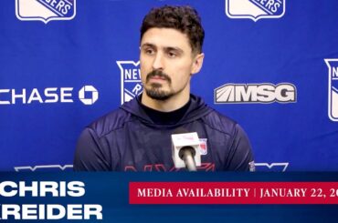 L’attaquant des Rangers de New York Chris Kreider répond aux questions des médias après le match du 22 janvier contre…