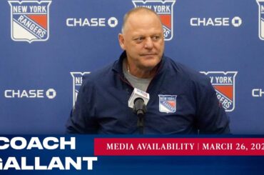 L’entraîneur-chef des Rangers de New York, Gerard Gallant, répond aux questions des médias après l’entraînement du 26 mars. » Abonnez-vous…