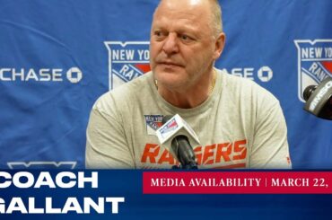 L’entraîneur-chef des Rangers de New York, Gerard Gallant, répond aux questions des médias avant le match du 22 mars contre…