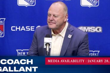 L’entraîneur-chef des Rangers de New York, Gerard Gallant, répond aux questions des médias avant le match du 28 janvier contre…