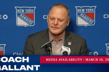L’entraîneur-chef des Rangers de New York, Gerard Gallant, répond aux questions des médias après le match du 10 mars contre…
