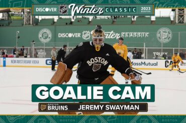 Le gardien de but des Bruins de Boston, Jeremy Swayman, porte une GoPro lors de l’entraînement de la Classique hivernale…
