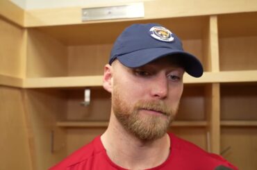 Le centre des Panthers de la Floride, Sam Bennett, rencontre les médias après que son équipe a battu les Jets…