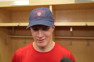 Le centre des Panthers de la Floride, Anton Lundell, rencontre les médias après que son équipe a battu les Jets…