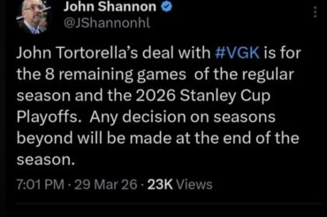 L’accord de John Tortorella avec VGK porte sur les 8 matchs restants de la saison régulière et les séries éliminatoires…