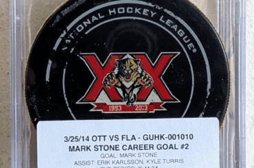 Heureux d’avoir décroché cette rondelle de but utilisée lors du match : but n°2 en carrière de Mark Stone le 25 mars 2014…