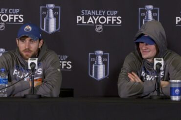 Leon et Klim parlent avec les médias après avoir tous deux marqué dans la victoire des Oilers 4-2, match 2,…