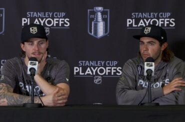 Adrian et Alex s’adressent aux médias après leur victoire sur les Oilers lors du premier match de lundi.