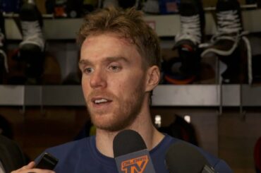 Connor parle aux médias après avoir prolongé sa séquence de plusieurs buts à cinq matchs alors que les Oilers battent…