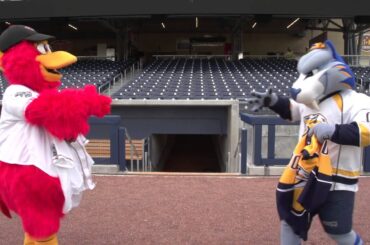 Booster, la mascotte de Nashville Sounds, rencontre pour la première fois la mascotte des Nashville Predators, Gnash, et lui fait…