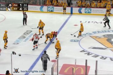 Noah Juulsen contre Jack McBain des Flyers de Philadelphie lors du match Utah Mammoth le 21 janvier 2026. via https://www.hockeyfights.com
