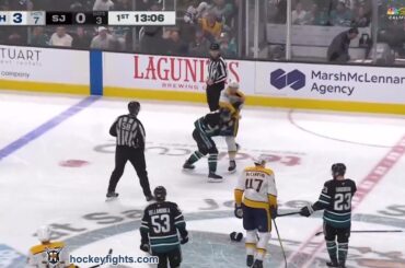 Cole Smith contre Luke Kunin des Predators de Nashville lors du match des Sharks de San Jose le 23 janvier…
