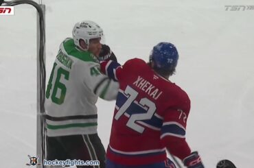 Ilya Lyubushkin contre Arber Xhekaj des Stars de Dallas lors du match des Canadiens de Montréal le 13 novembre 2025.…
