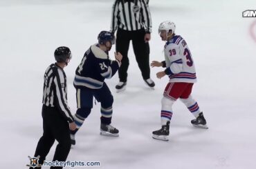 Sam Carrick contre Mathieu Olivier des Rangers de New York lors du match des Blue Jackets de Columbus le 15…