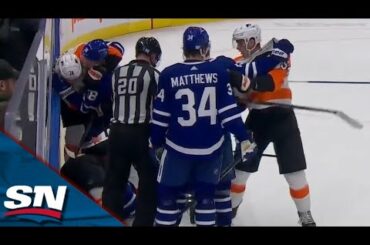 Regardez Michael Bunting et Mark Giordano intervenir pour défendre Auston Matthews de Travis Konecny, suivis par le défenseur des Maple…