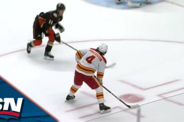 Le défenseur des Ducks, John Klingberg, attend que le couloir de tir s’ouvre et place un gardien des Sharks derrière,…