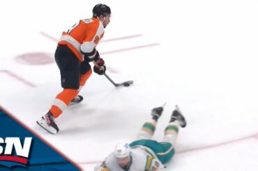 Après avoir marqué le but égalisateur à la fin de la troisième période, Dylan Cozens vole la rondelle à Patrice…