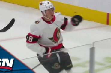Regardez l’attaquant des Sénateurs d’Ottawa Tim Stützle prendre une passe étirée de Maxence Guenette avant de mettre son tir du…