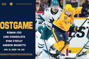 Le capitaine Roman Josi, Luke Evangelista, Ryan O’Reilly et l’entraîneur-chef Andrew Brunette parlent aux médias après avoir affronté les Sharks…