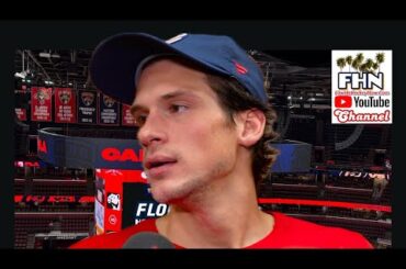 L’attaquant des Panthers de la Floride, Eetu Luostarinen, rencontre les médias après que son équipe a battu le Tampa Bay…