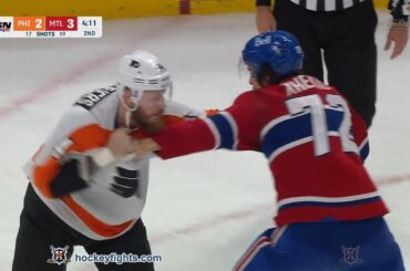 Nicolas Deslauriers contre Arber Xhekaj des Flyers de Philadelphie lors du match des Canadiens de Montréal le 19 novembre 2022.…
