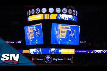 Pendant une pause publicitaire, les Sabres de Buffalo ont rendu hommage à l’ancien joueur Jack Eichel avec un hommage vidéo…