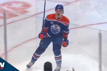 L’attaquant des Oilers d’Edmonton Connor Clattenburg enterre une rondelle libre pour son premier but en carrière dans la LNH afin…