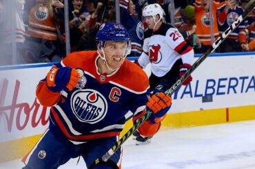 L’attaquant des Oilers d’Edmonton Connor McDavid prend la passe de Zach Hyman et bat Mackenzie Blackwood, donnant aux Oilers une…