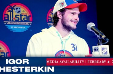 Le gardien de but des Rangers de New York, Igor Shesterkin, répond aux questions des médias le 4 février après…