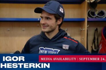 Le gardien de but des Rangers de New York, Igor Shesterkin, répond aux questions des médias après le quatrième jour…