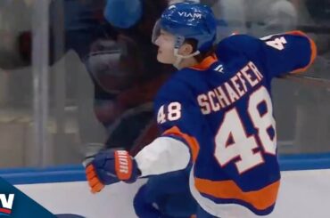 Regardez le défenseur des Islanders de New York Matthew Schaefer trouver un espace pour entrer et décocher un tir du…